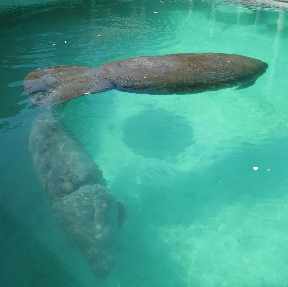 | First stop was the manatee exhibit. Manatees are funny creatures. I had only very recently seen my very first manatees in the wild (up in Jupiter) so it was especially interesting to see them up close and personal here. This guy has rolled over on his back. I'm pretty sure that's his bellybutton you see in the lower right. |