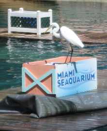| I was amused watching this egret. He was hanging around at the back of the action during most of the show, then as it ended he walked out to this box, which is where they kept all the fish they'd been using as treats for the dolphins. |