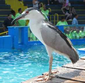 | And, another case of the wild ones learning where the food is.... This night heron was waiting around the whole show for his chance at the whale treats. You can actually see him in the center of the "stage" in the previous photo. |