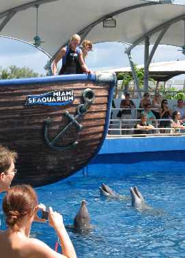 In any case, the Flipper show features several dolphins jumping and doing other dolphin things. You know what? It's really hard to get a good picture of a dolphin jumping. You need to have your camera pointed at just the right spot, in focus, and have the shutter open at exactly the right time (which is especially hard with these new autofocus cameras :-) The best I got is at right. |