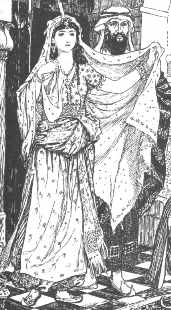 Alas, the Dover edition doesn't include "Ali Baba", but there are indeed lots of illustrations here, many or most of which show women in interesting, detailed costuming (right, "Scheherezade, Dinarzade, and the Sultan"). The images are probably closer to "authentic" than most other pictures I've seen--no scantily clad females here! I had a hard time selecting which ones to show.