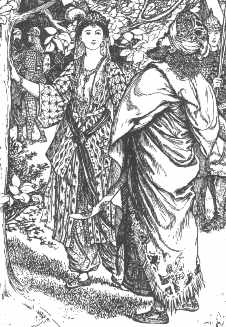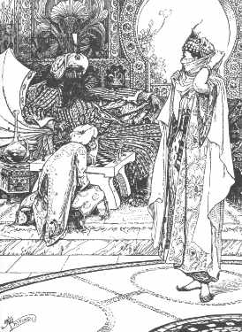 | This is a detail from "Parizade shows the singing tree to the Sultan" from "The Story of Two Sisters who were Jealous of their Younger Sister." The designs on her coat are lovely. |