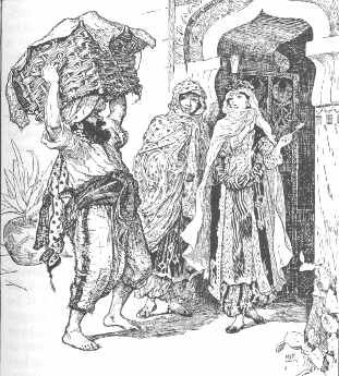 | The picture at right is captioned "The man is astonished at the beauty of the porteress" from the "Story of the Three Calenders, Sons of Kings, and of Five Ladies of Bagdad." |