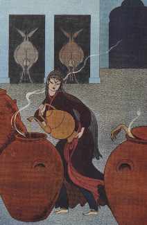 | And here she is at it again, captioned "She poured enough into every jar to stifle and destroy the robber within." Here I'm amused by the donkey butts in the stalls, and a bit disturbed by the hand hanging out of one of the jars. |