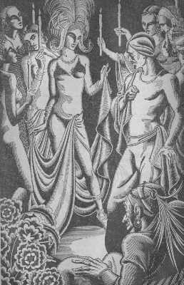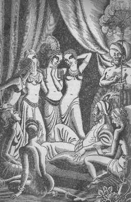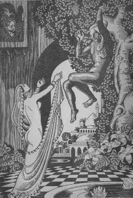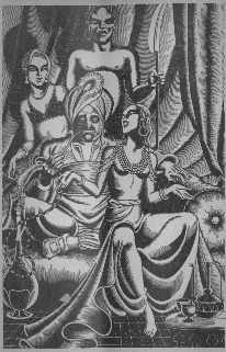 | The picture at right is from the start of "Tale of Nur al-Din Ali and his Son Badr al-Din Hassan." I'm amused by the leer on face of the guy in the lower right. |