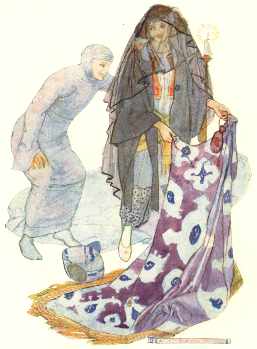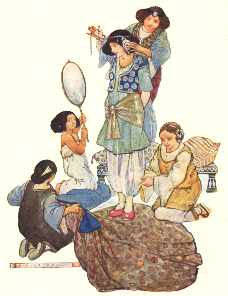 | The image on the left is from the story of Alladin, captioned "The Princess made her women dress her in the most becoming manner." |