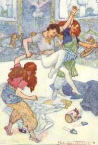 | What do you know, here's another dancer. This one is from "The Sleeper Awakened", captioned "Abou Hassan stripped off the fine robes of the Caliph, and began to skip and dance with two of the damsels." |