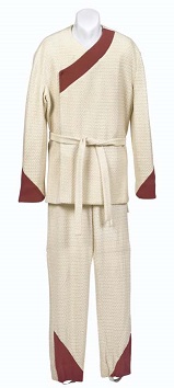 The costume looks like a fairly basic tunic and pants, but of course I needed to do research to get more details. The most helpful lead was info on an auction of some of the screen-used costumes, which included the pic at right along with a description of the costume as being of textured cream cotton, and comprising a shirt, pants, and jacket. The pic at right is Worf's: his has the burgundy trim signifying his status as a MoQbara master; the others we see in TNG do not have colored trim. We do note that the pic at left seems to show only the jacket and pants, but not the shirt. It's also interesting to observe that the pants have stirrups, but I don't think that's something I'd feel compelled to reproduce.