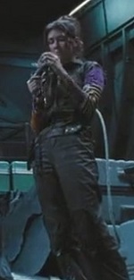 In general, when doing mashups, it's important to have the parts be very clear. My original Kaylee costume wasn't screen-accurate enough to be very useful for pirate-izing. But I had recently purchased commercially-made Kaylee "Teddy Bear" overalls that would probably work out real well. (I'm not especially fond of teddy bears, nor of that particular outfit of Kaylee's, but they were on a really good sale from ThinkGeek (iirc) so I couldn't resist.) And of course, I already had a number of pieces from my pirate cosplays that could be useful. The boots would hide the issue I had with the overall's legs being bit short. A belt would be useful for carrying things, as well as holding my Firefly flask and maybe my faux sword (and hey, Kaylee actually wore a belt in the movie (pic at left)).