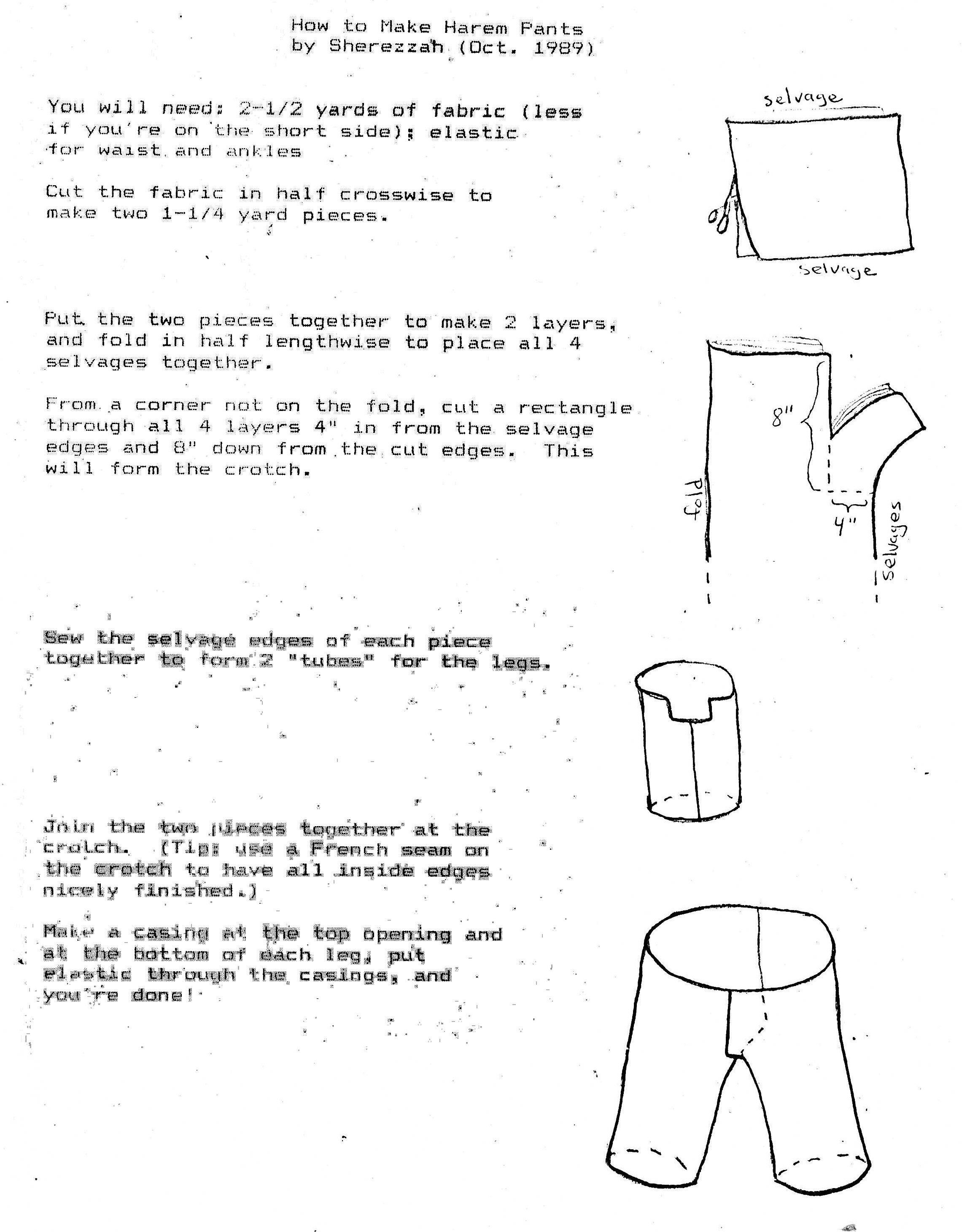 I made a handout for my classes on how to make harem pants, so until I get a chance to convert into reasonable HTML, I do have this scanned image. (Sorry about the bit of blurriness in the last couple of steps; the original was very light, as was the scan, and the blurriness is an artifact of trying to darken it. Hopefully it's sufficiently readable.) You should be able to click on the image to get the full-resolution version in case you prefer that.