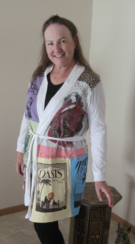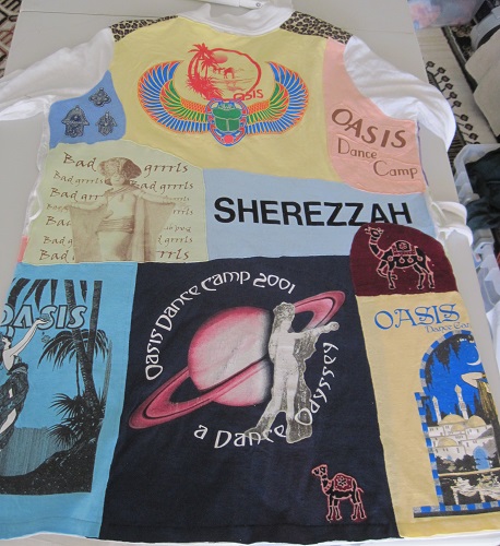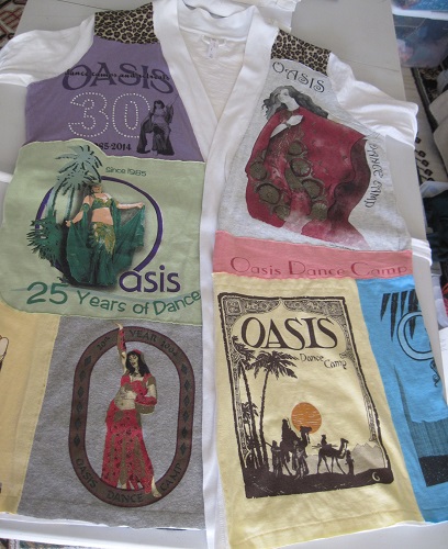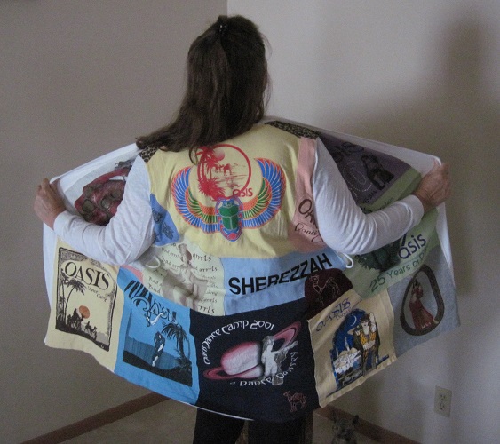 Meanwhile, I still had a surplus of Oasis t-shirts, mostly from Rachel and Katina's dance estates. We'd made a t-shirt quilt out of some (gifted it to Saida), and were able to sell some, but there were still quite a few left. It occurred to me that if I could cover the robe with a patchwork of t-shirt pieces, it would no longer be see-thru, which would make it usable for Camp. Plus, it would help get rid of some of those surplus shirts!