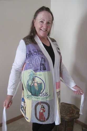 I don't have an interim pic for it, but the left front went similarly. I positioned the Khaleegy lady as high up as I could. Alas, that cut out part of the word "Oasis" at the armscye, but I fixed that by cutting the word off and inserting a non-graphic piece of the same t-shirt. I put the word back in a new spot over her head later. Unless you look close enough to see the stitching, it looks like it was always that way. The Khaleegy lady was a fairly large patch, so that left a rather narrow strip (maybe 1-2"?) of uncovered robe left between her and the Oasis sheet music patch below. One of the ways I'd thought about to fill in small areas like this was to use just text pieces cut from the shirts, like "Oasis Dance Camp" either as the full phrase or as individual words. Not all the shirts have suitable text for this, but it turns out a couple of the ones with the nudity did, and one of them worked out just perfect for this spot.