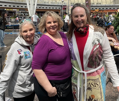 Then it was just a matter of finishing it. It had been pretty easy and fast putting on all the initial large rectangular pieces, but as the empty spaces got smaller and more oddly-shaped, it required more planning and fiddling. But eventually it all came together and I was really happy with the result. Especially since it was finished in time for me to bring to Oasis Dance Camp 2024 in Indiana, where it worked out well as a jacket as well as a robe. Here I am meeting up with friends at the airport: