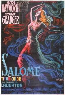 | The 1953 film starring Rita Hayworth is probably the most well-known of all the Salome movies. Of the posters I've seen, I like this Italian one the best, for obvious reasons: the colors are great, and she's dancing. (I got this one as a reprint on eBay.) |