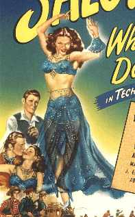 | OK, this one is cheating a bit. Salome, Where She Danced is a 1945 movie starring Yvonne DeCarlo. However, it's not about the Biblical Salome. It is, if you can believe it, a Western. However, she does dance in a way that vaguely resembles belly dancing in that old Hollywood way. This is a poster for it--well, part of the poster. Again, I couldn't fit it all in my scanner, but I did get the important part. |