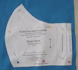 | 3. When cutting the main piece, I added an extra 1/2" to the seam allowance on that same ear section, even beyond the extra 1/2" they indicate on the pattern for thicker cord. This is because I had made a previous mask with the pattern as a test, and I could only fit a rather thin cord thru the opening when I actually finished it, even though I was fairly certain I had cut it at the "thicker cord" position. Although it's possible I was misremembering what I did with the test mask, I knew the cord I would be using on this new one was going to be thicker, so figured I'd rather be safe than sorry. I was glad I did. |   |