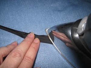 | 5. Next (before joining the main piece with the lining), I needed to add the black border strip at along the top part of the main piece. My thinking was that this would create the pocket wherein one could place a nose wire. Design-wise, I didn't just want a straight line across the top of the entire mask; I only wanted it across the center part. I'd been thinking that bias tape seam binding would work for the black border, but the only style I had in stock in black was narrow (1/4") double-fold. Clearly 1/4" was too narrow, and single-fold would've been more like what I needed. So I cut a piece around 9" long and pressed open the middle fold and one side fold. This gave me a piece about 5/8" wide with one folded edge to be the bottom of the stripe, visible on the outside. The (raw) top edge would be contained in the top seam of the mask. |   |
