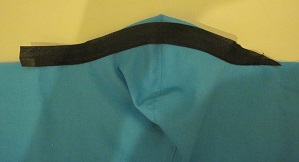 as I pinned the strip in place. Then I stitched along the bottom edge of the strip on each side of the center, starting about 1/2" away from the center seam, and continuing out past the main seam line. This left about a 1" opening in the middle of the strip that I figured I could use to insert/remove the nose wire. |   |
