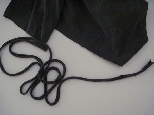 | 9. I was kinda short on elastic, especially thin elastic, so I took a tip from a friend and used T-shirt string. You cut a strip about 1 inch wide from a T-shirt and pull it, causing it to curl up into a string. The cut doesn't even need to be terribly neat, and a strip cut horizontally around the shirt is plenty long. I had a black T-shirt, and did this to use in place of regular elastic. It works fine and is very comfortable. It is, however, a bit thick which is why I wanted to be sure I had an extra-wide casing to fit it. |   |