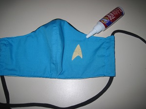 | 11. I decided I wanted to include a TOS insignia on the mask. After much poking around my available supplies, I decided to go with a simple delta, about 1.5" high, cut from felt of a color that I'd describe as light peach. After experimenting a bit with placement, I used fabric glue to stick it in place. (I did think to put something inside the filter pocket area to protect against the glue possibly coming through and sticking it closed, but that didn't seem to be an issue.) I chose the felt mainly because it would be the easiest to do, but I'm really pleased with how it ended up looking! |   |